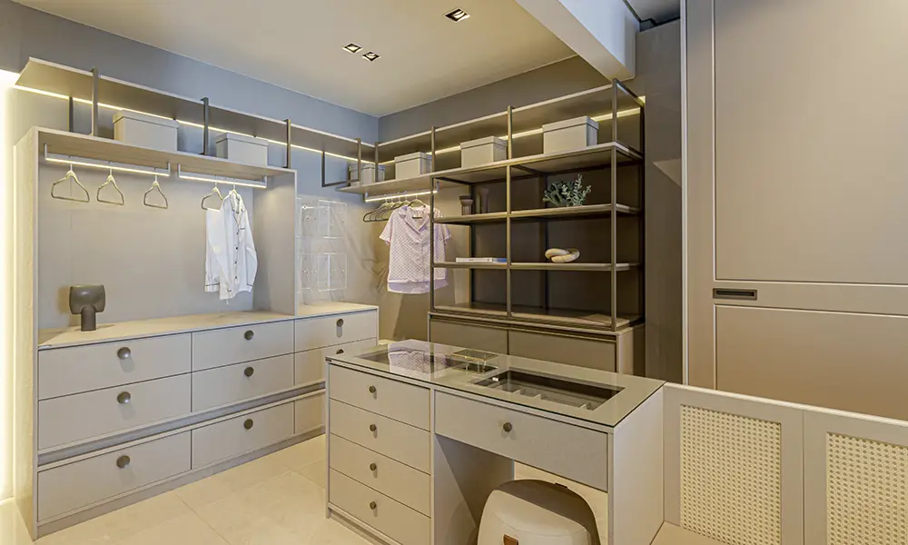 É comum que o closet feminino esteja integrado ou próximo a uma penteadeira, prevendo apoio para maquiagem, cuidados pessoais e uso de ferramentas térmicas, como secador e babyliss.